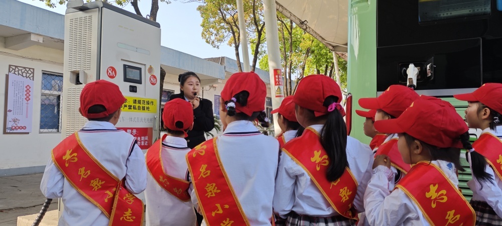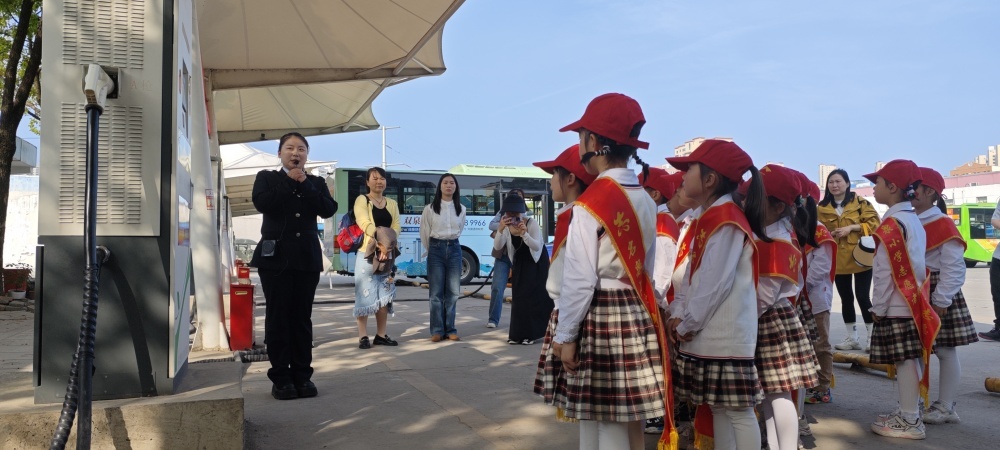 圖/在公交充電站,工作人員向同學(xué)們介紹充電樁的工作原理和純電動公交車的運行優(yōu)點。