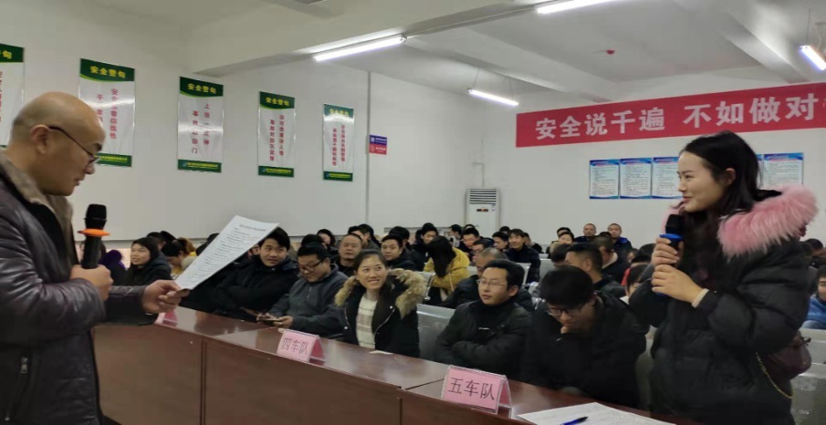 由二公司支部書(shū)記金波介紹了活動(dòng)要求。隨后安全經(jīng)理王明宏宣讀了安全知識(shí)競(jìng)賽規(guī)則活動(dòng)事宜。本次安全知識(shí)競(jìng)賽由二公司五個(gè)車(chē)隊(duì)分別派出兩名駕駛員為代表,各車(chē)隊(duì)在安全教育上進(jìn)行宣講。競(jìng)賽分為必答題、觀眾答題等多種形式,最后以各車(chē)隊(duì)獲得的積分評(píng)獎(jiǎng)。此外還有觀眾(駕駛員)答題,當(dāng)場(chǎng)回答正確的駕駛員均有禮品贈(zèng)送。本次競(jìng)賽選手踴躍答題,觀眾熱情洋溢積極參與,整個(gè)活動(dòng)非常成功。參加比賽的選手獲得了豐富的獎(jiǎng)品。競(jìng)賽結(jié)束后大家又一起來(lái)到修理車(chē)間,觀看了車(chē)間員工安防滑鏈演練活動(dòng)。