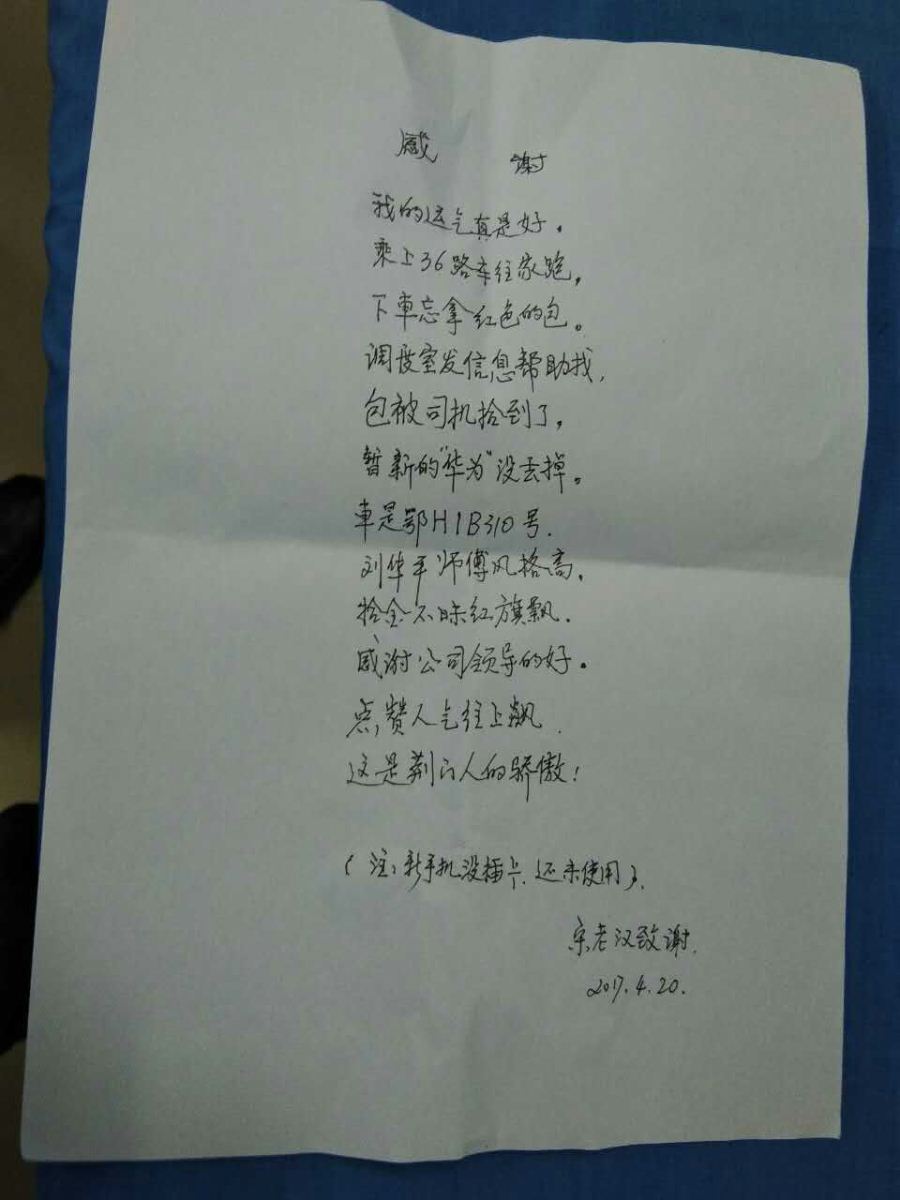 36路司機拾金不昧,失主作詩贊揚