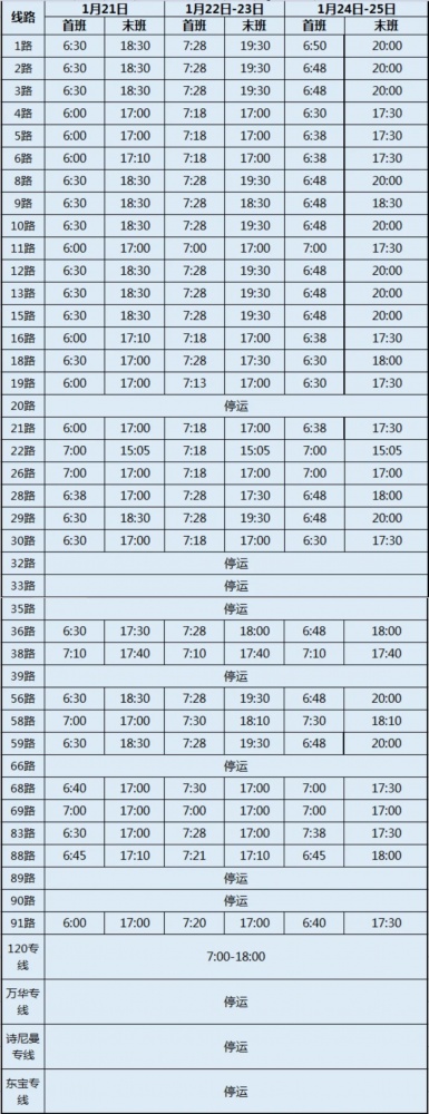 1月21日—1月23日(三十、初一、初二),營運(yùn)時(shí)段7:00-17:00,中午11:30-14:30停班。