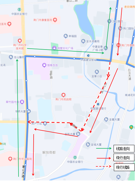 取消原停靠站點(diǎn):市二醫(yī)口腔醫(yī)院(西側(cè))、公交家屬區(qū)(西側(cè))、象山市場(chǎng)(北側(cè))、銀泰百貨(北側(cè))。